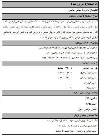 الگوساز لباس به روش حجمی یکی از مشاغل مربوط به صنایع پوشاک است که دارای شایستگی هایی از قبیل ساخت الگوی دامن به روش حجمی، ساخت الگوی باالتنه به روش حجمی، ساخت الگوی آستین به روش حجمی، ساخت
